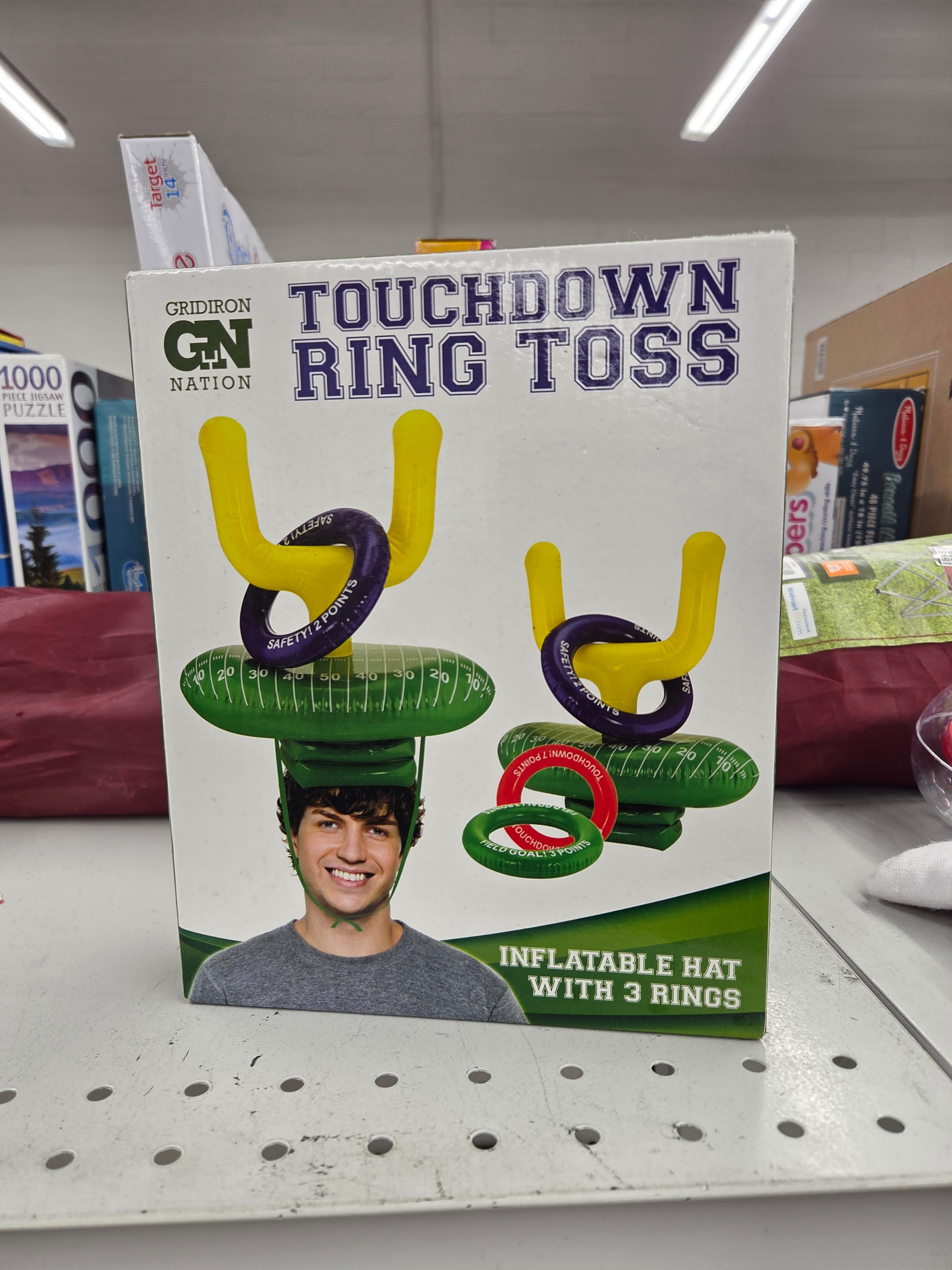 Sadly, even though they nailed the football theme with the hat itself, the ring scoring is not standard to football like mine is. They have chosen the no-context-at-all 25/50/100 scoring system with these, and I have to assume that’s because it’s illegal to watch football in China when you should have your head down at the factory making ring toss hats.